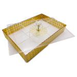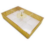 Al Hoora 30.5*20.5*H10Cm Rect. Acrylic Gold Serving Tray,Cake Dish,Dessert Tray,Candy Dish W/ Geometric Pattern , 6 Divider , Clear Cover , Rose Flower Knob And Color Box